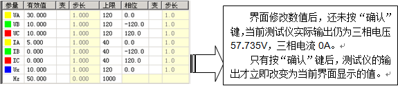 首先選擇“手動”試驗方式,在試驗輸出狀態下,依次直接修改所需改變的各相的參數(幅值或相位)。按“確認”鍵之前,盡管界面上的數據已經修改,但測試儀實際輸出的電壓電流還是修改前的。全部修改完后按“確認”鍵,測試儀的各相輸出立即同時改變為修改后的值。由于這種改變是各相同步改變的,所以能適應某些突變量起動的保護的輸出要求。