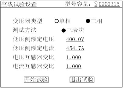 2)在主界面中選擇空載試驗,則顯示空載試驗設(shè)置界面如下圖: