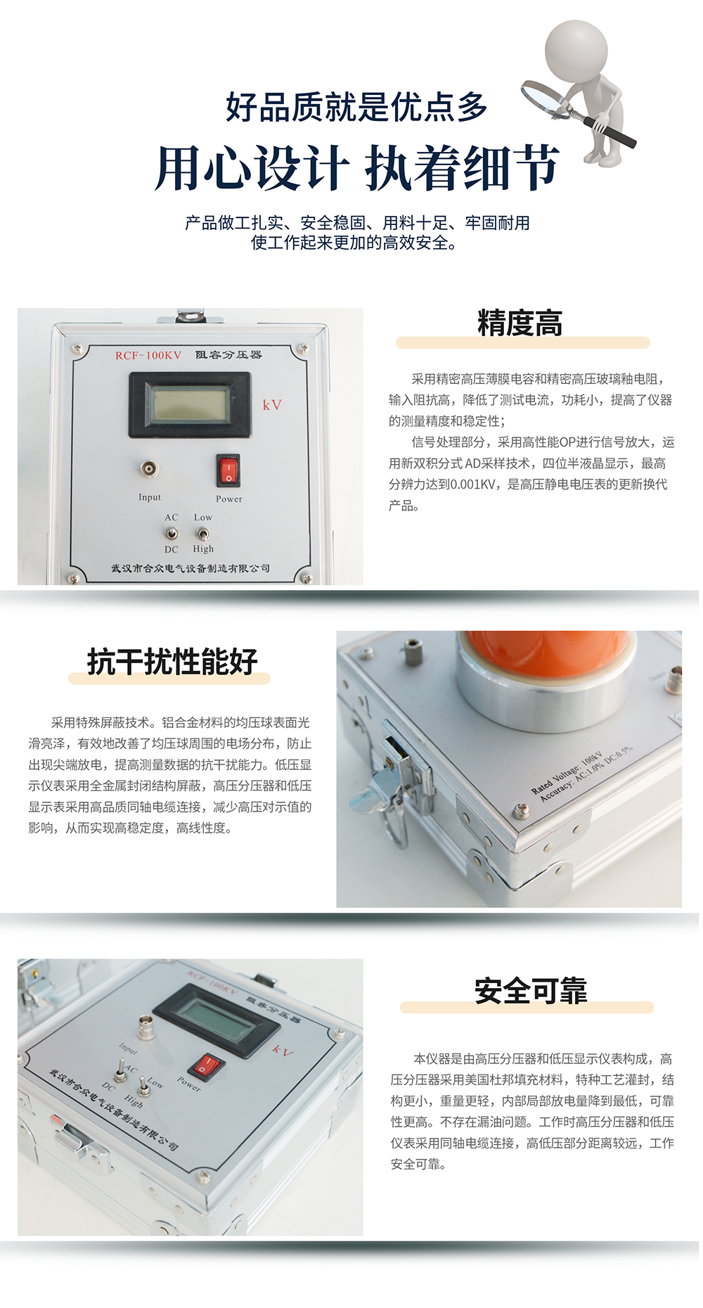 采用特殊屏蔽技術。鋁合金材料的均壓球表面光滑亮澤,有效地改善了均壓球周圍的電場分布,防止出現尖端放電,提高測量數據的抗干擾能力。低壓顯示儀表采用全金屬封閉結構屏蔽,高壓分壓器和低壓顯示表采用高品質同軸電纜連接,減少高壓對示值的影響,從而實現高穩定度,高線性度。