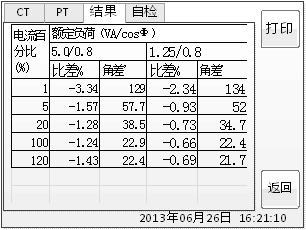 智能互感器測試儀上圖中顯示了互感器分別在額定負荷與下限負荷下的比差、角差表,額定負荷是在CT設置頁面中,下限負荷規定為25%的額定負荷。