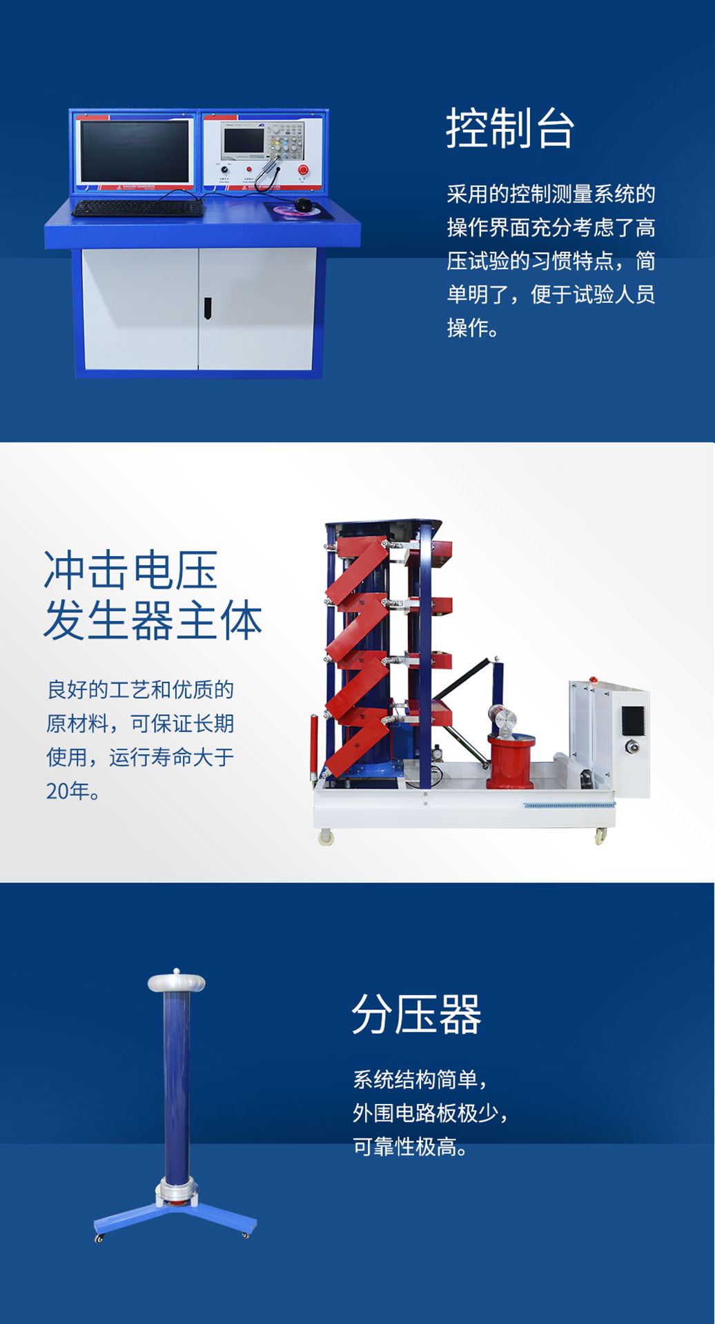 發生器本體、截波、分壓器、四組件控制臺(控制臺分為微機型和普通型)、數字化波形記錄系統等組成。