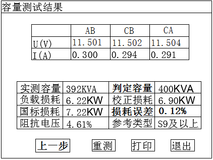 國標損耗:如測得容量歸檔,則顯示所歸檔位的變壓器國標短路(負載)損耗值。