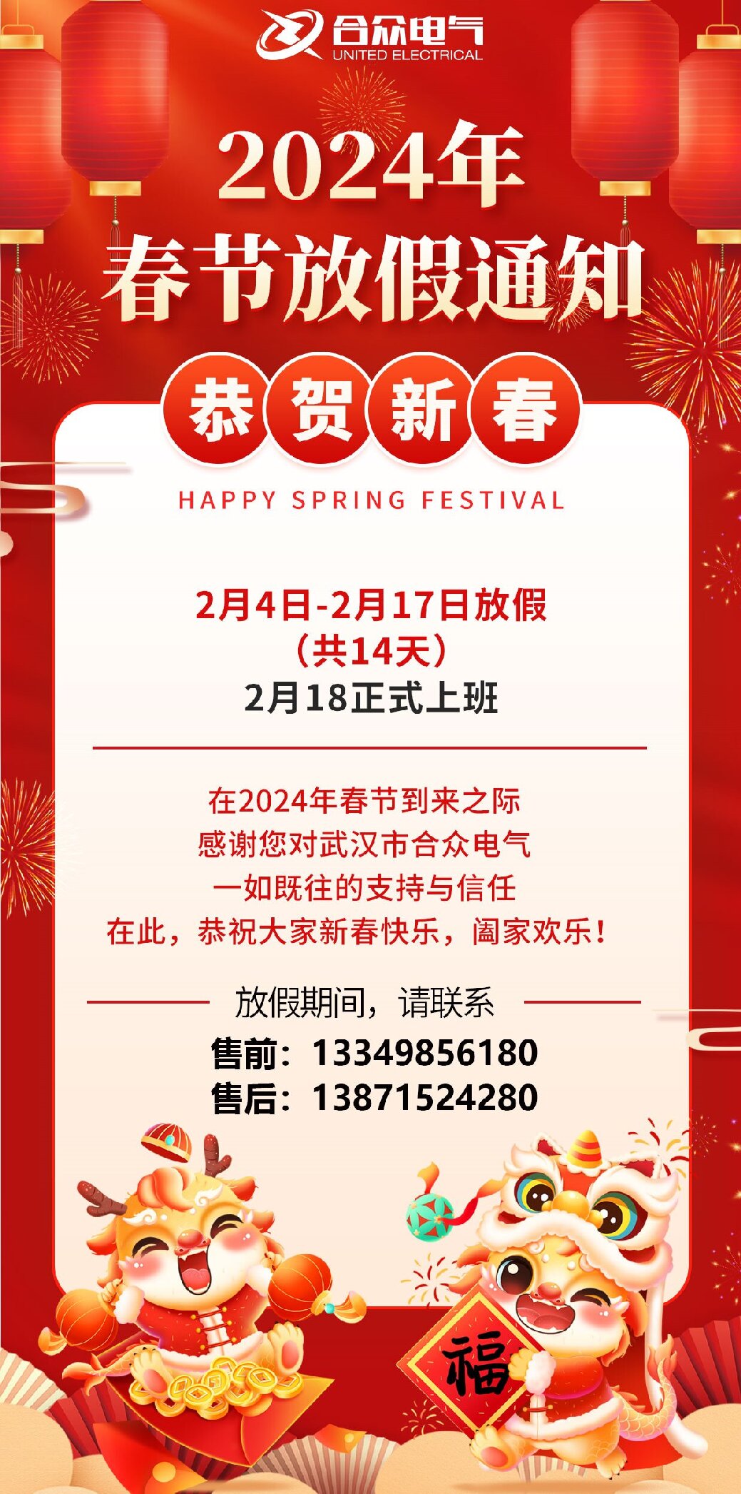 武漢市合眾電氣春節(jié)放假通知及春節(jié)福利到